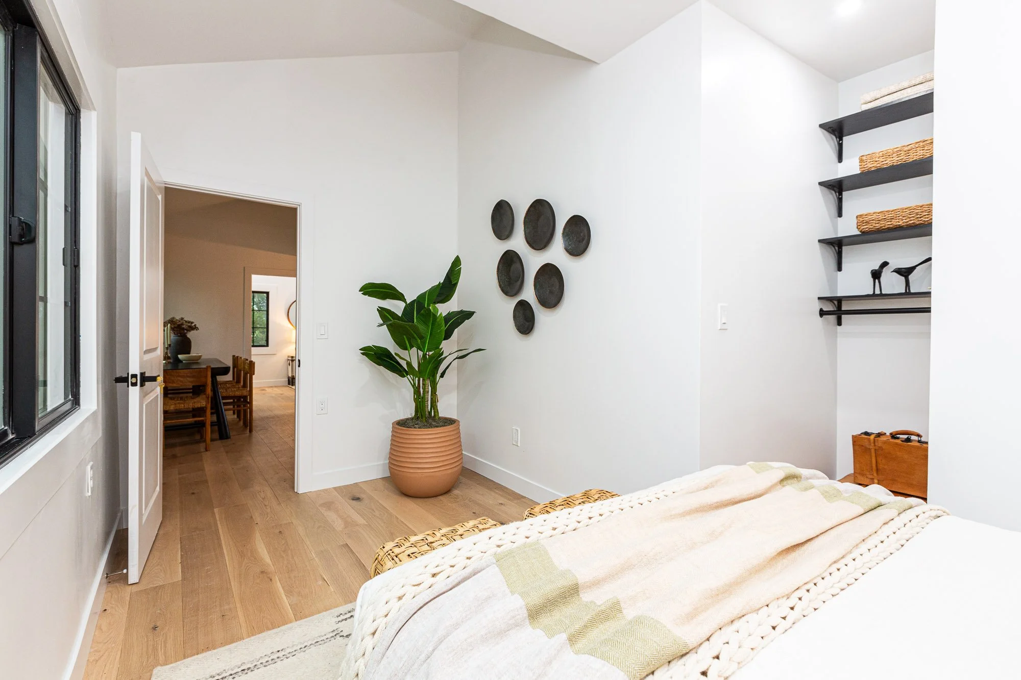 A bedroom with white walls and wooden floor, a large green potted plant, black decorative plates on the wall, black shelves with woven baskets, and a bed with a light-colored blanket. View fullsize