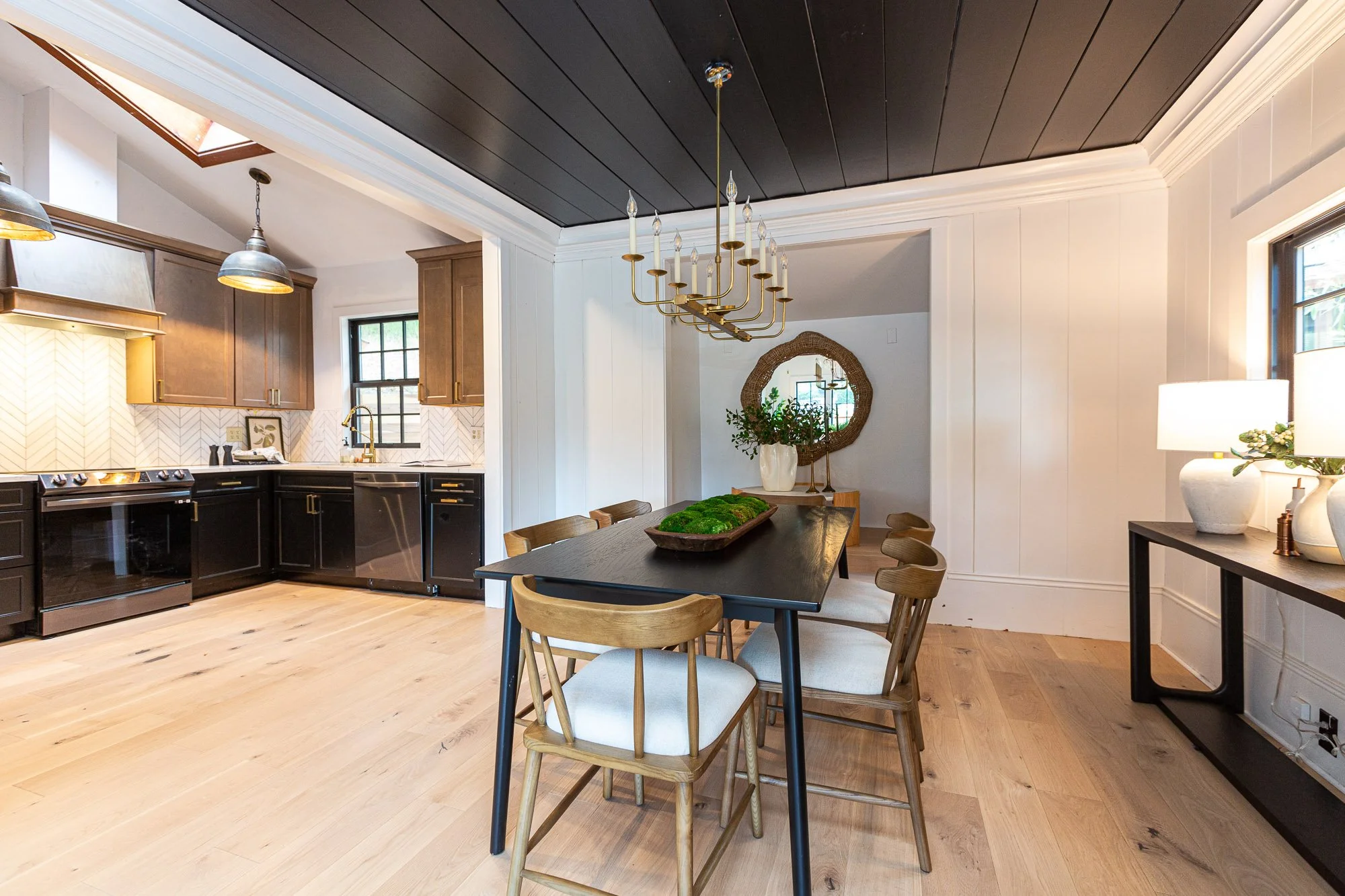 Open-concept kitchen and dining area with black and wood cabinetry, light hardwood floors, a black dining table with wooden chairs, and decorative lighting and plants.