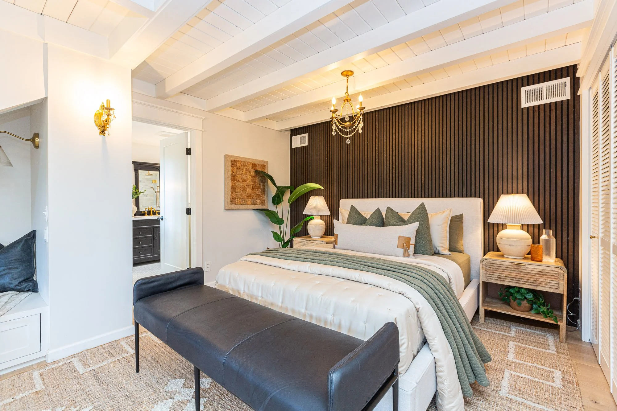 A nicely decorated bedroom with a large bed, beige bedding, and multiple pillows, two bedside tables with lamps, a dark wood accent wall, a chandelier, a plant, and an entry to an en-suite bathroom.
