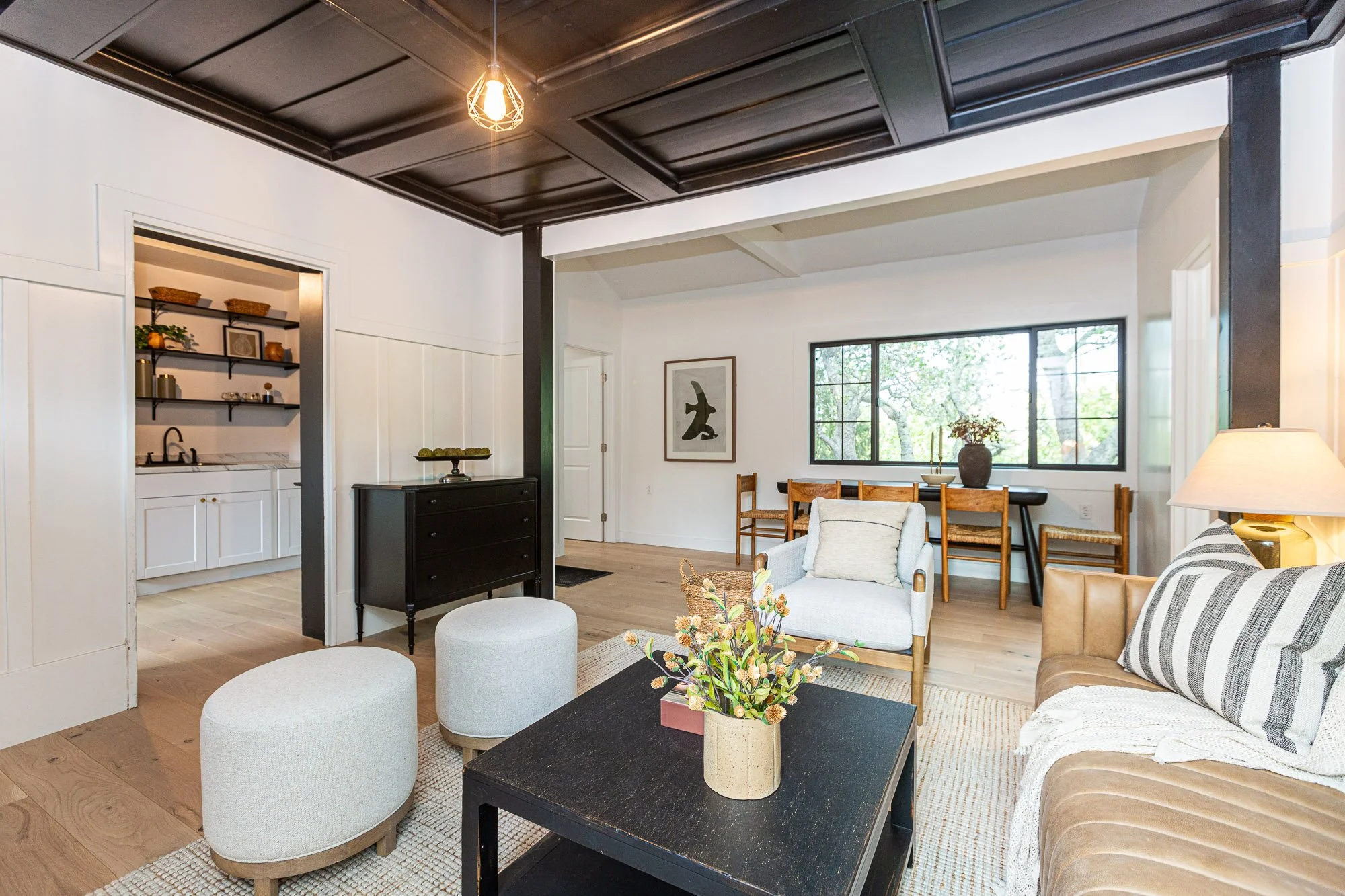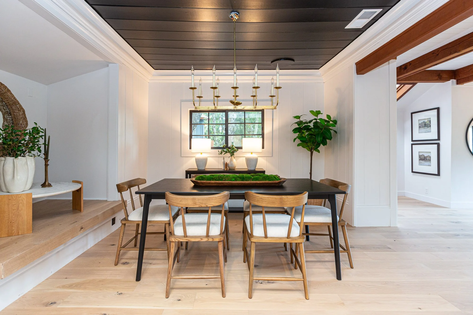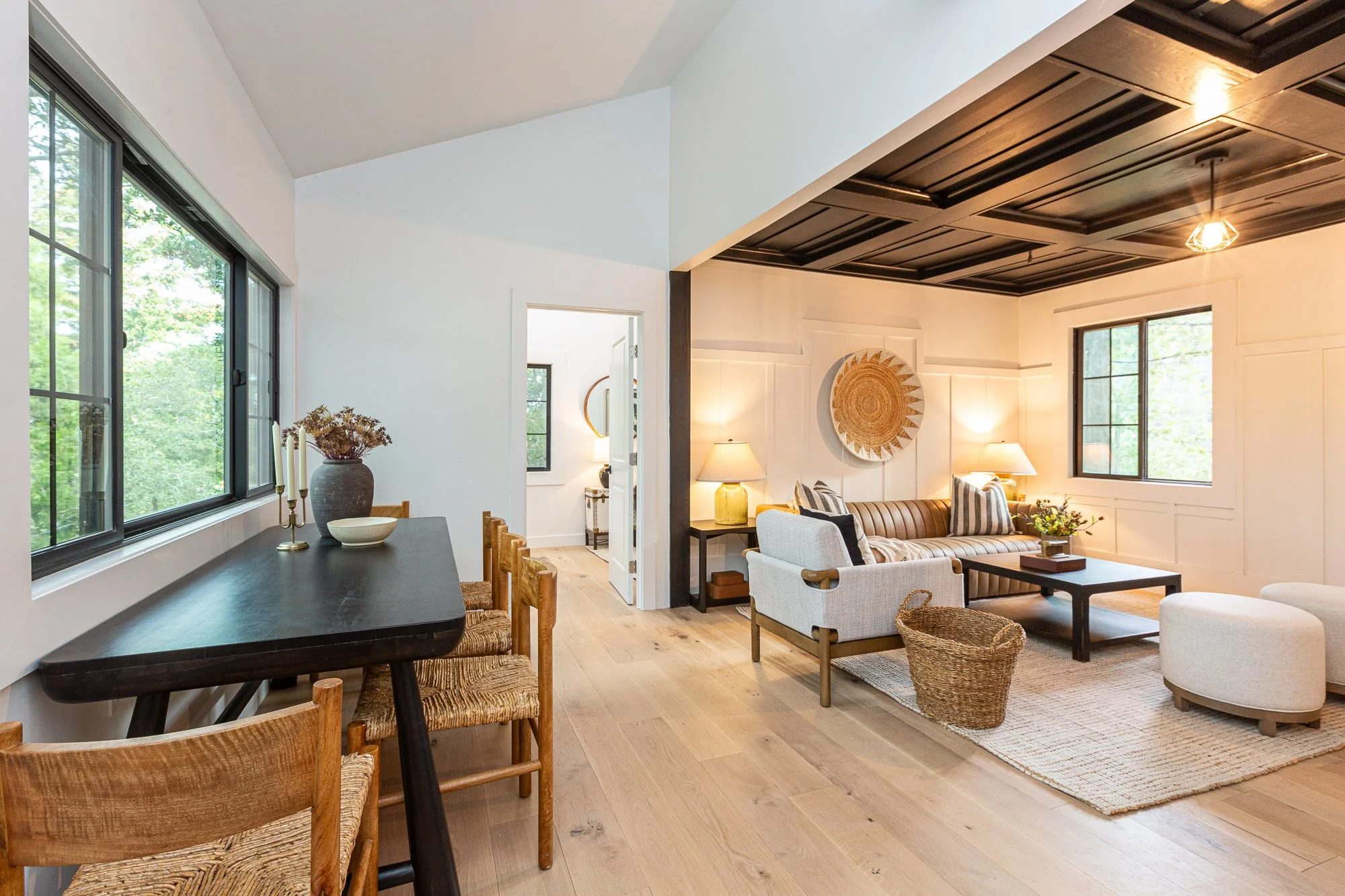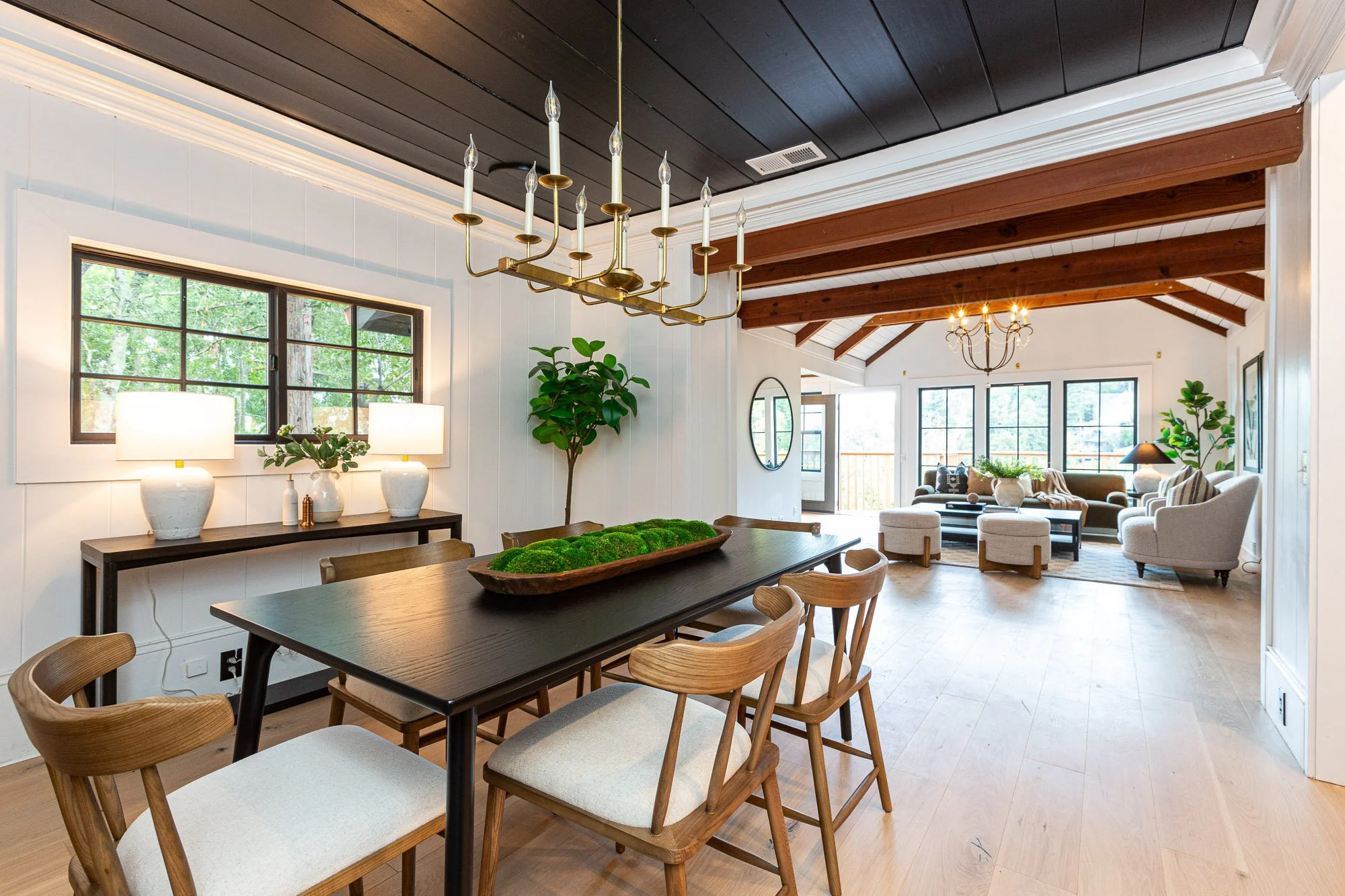 Bright living room with white walls, wooden vaulted ceiling, chandelier, beige armchairs, black coffee table with decorative objects, potted plant, white area rug, and an open dining area with wooden table and chairs in the background.