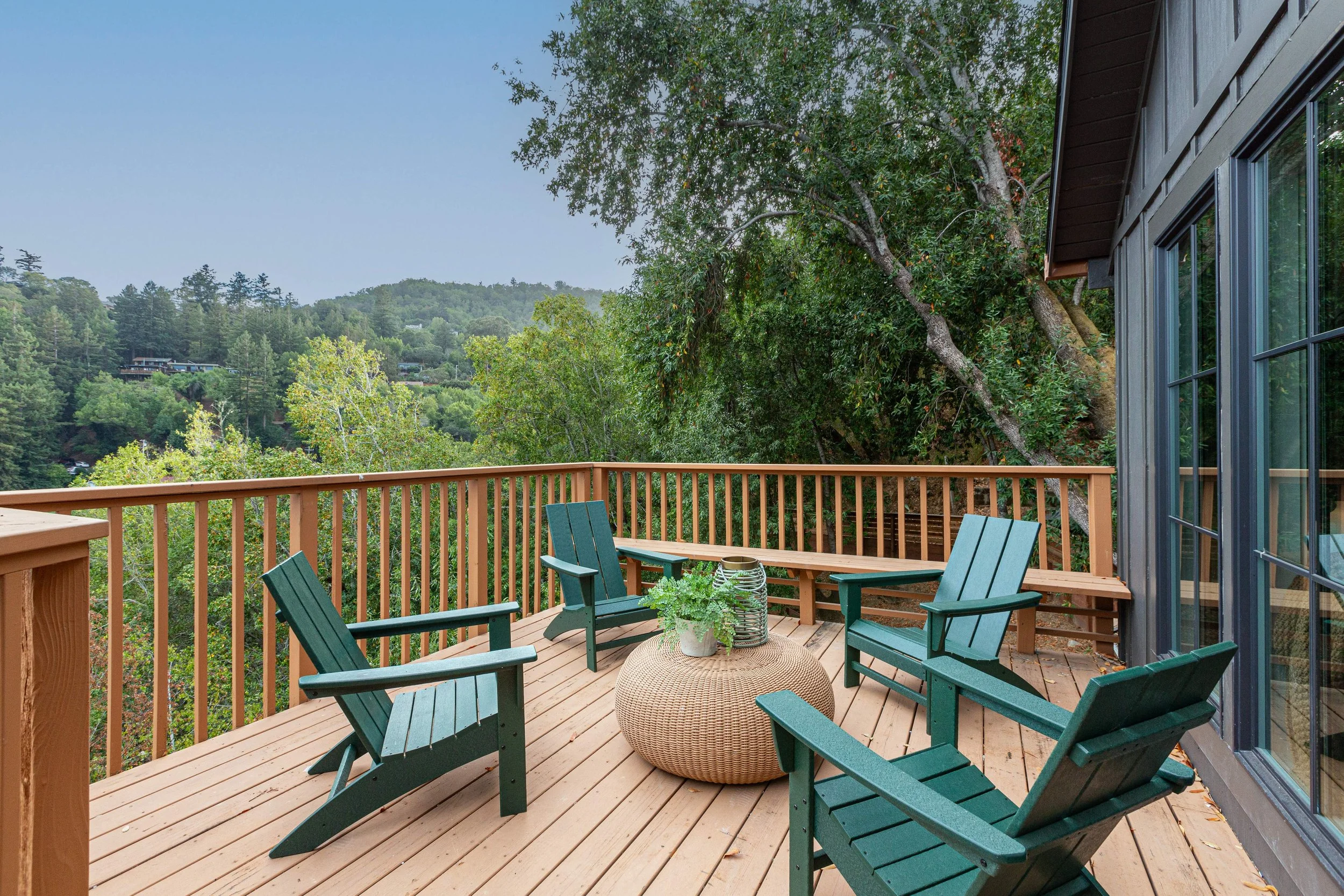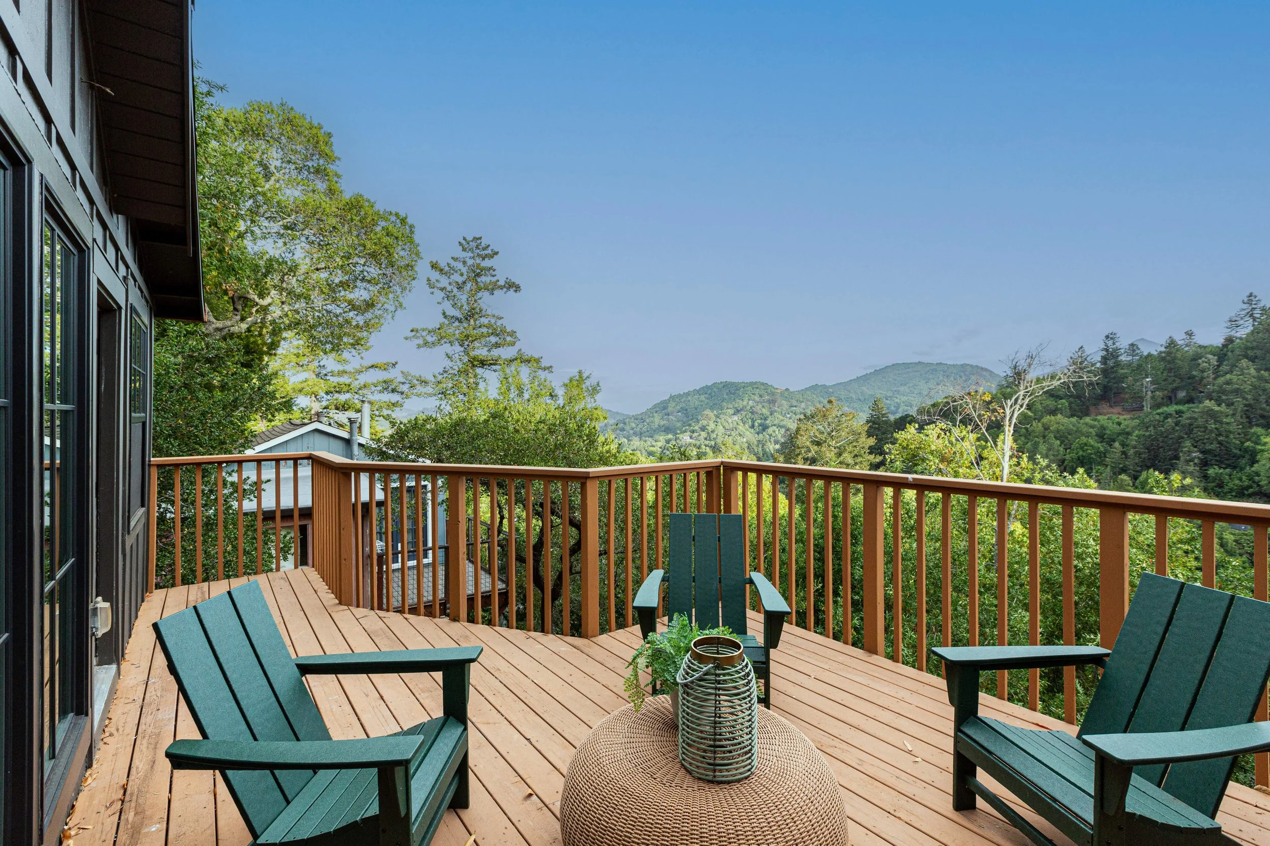Outdoor wooden deck with green Adirondack chairs, a small woven table, and a view of trees and hills in the distance.