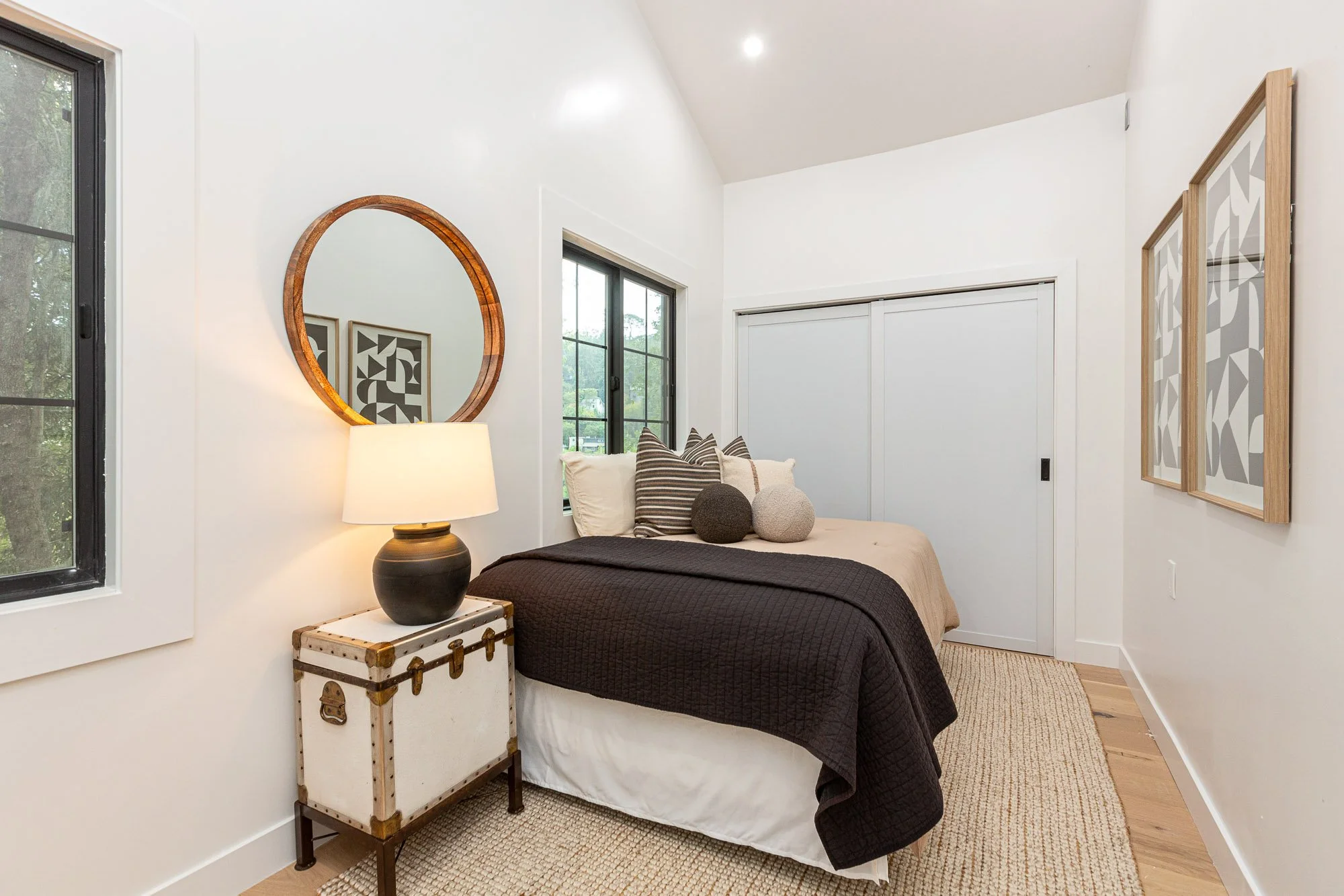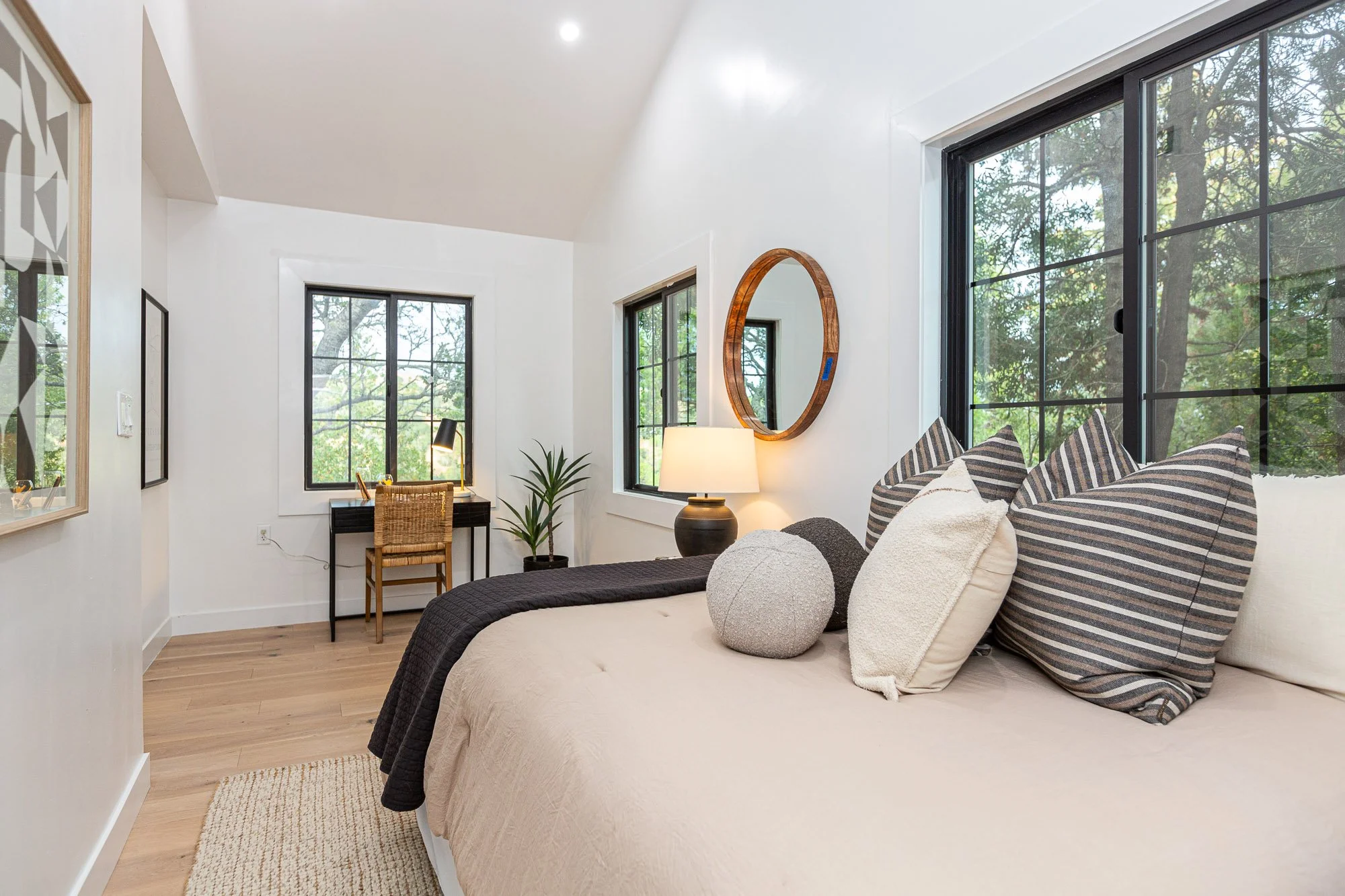 Bright bedroom with large windows, a bed with striped and cream pillows, a round mirror, a table lamp, a desk with a chair, and a houseplant.