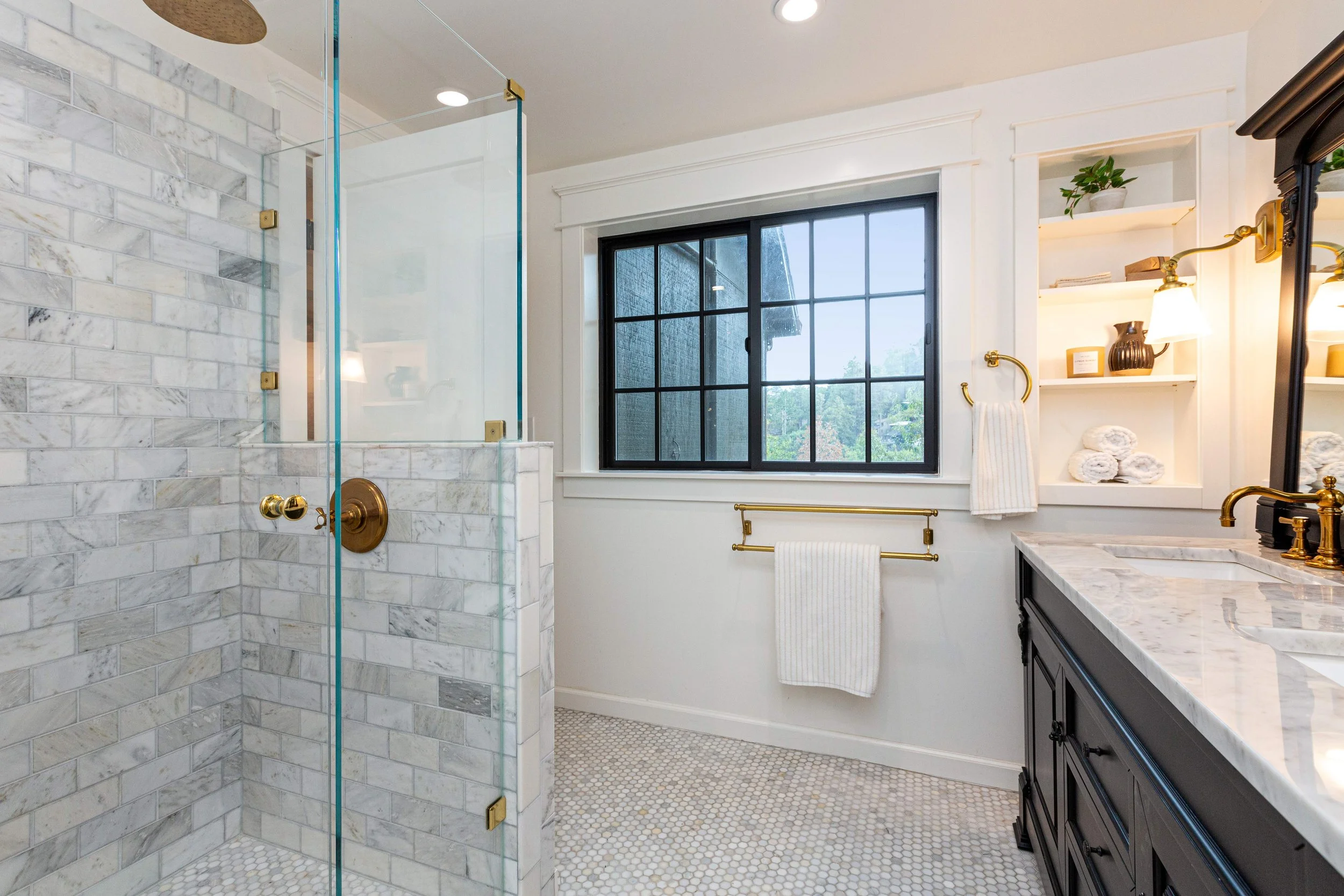 Bathroom with white marble tiled shower, black window, and cabinetry with brass fixtures. View fullsize