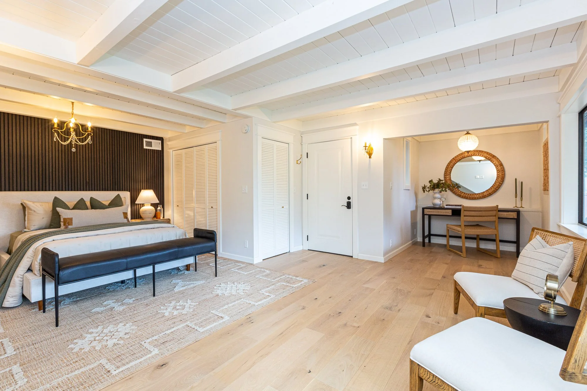 A modern bedroom with a large bed, nightstand, lamp, and chandelier. There's a bench at the foot of the bed, a rug, and light wood flooring. An entry door, closet, and a small workspace with a mirror, plant, and chairs are visible.