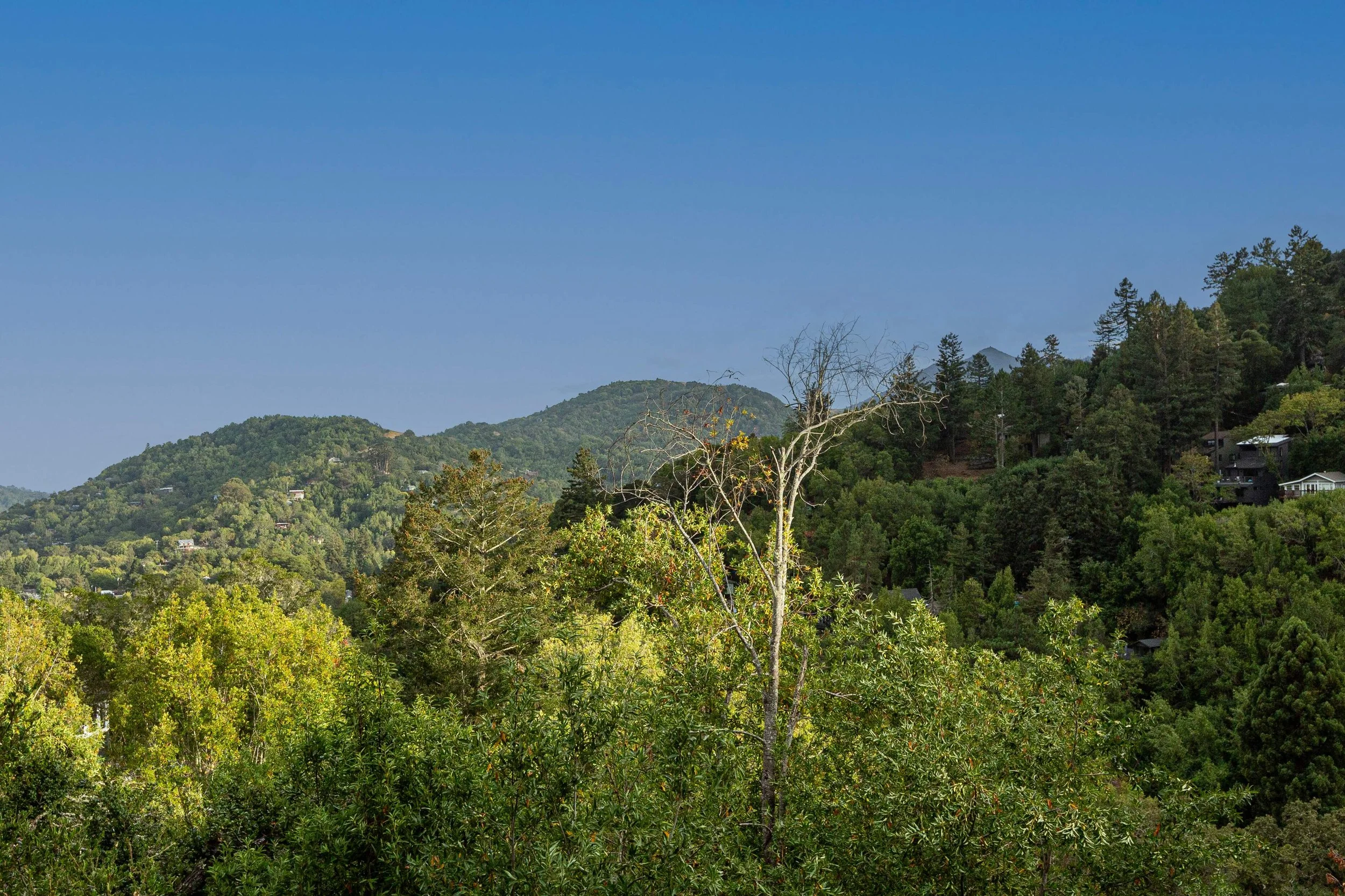 Scenic view of a forested hillside with lush green trees, some houses on the right, and mountains in the background under a clear blue sky. View fullsize