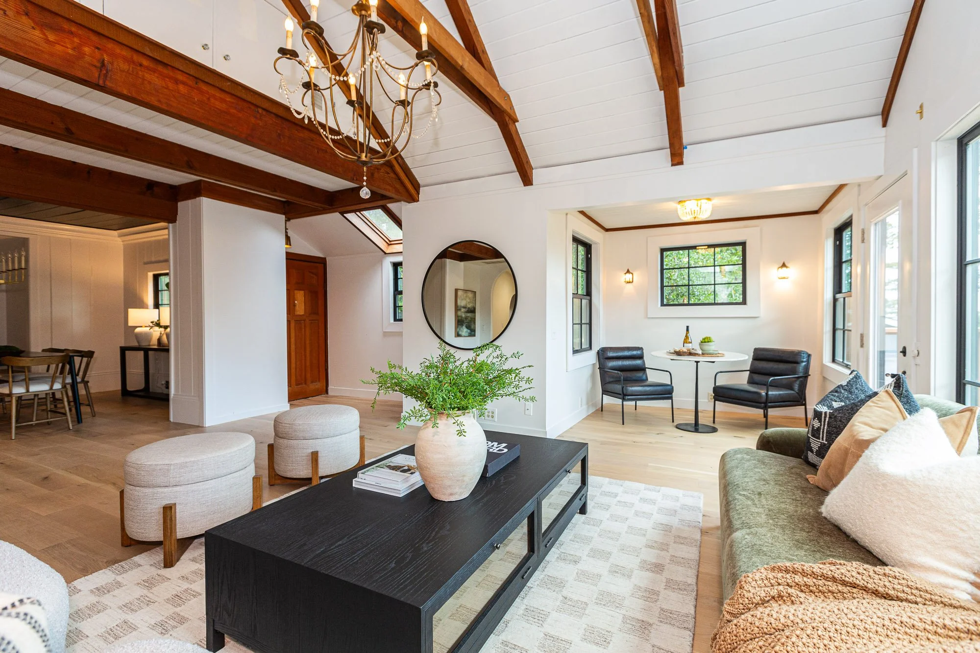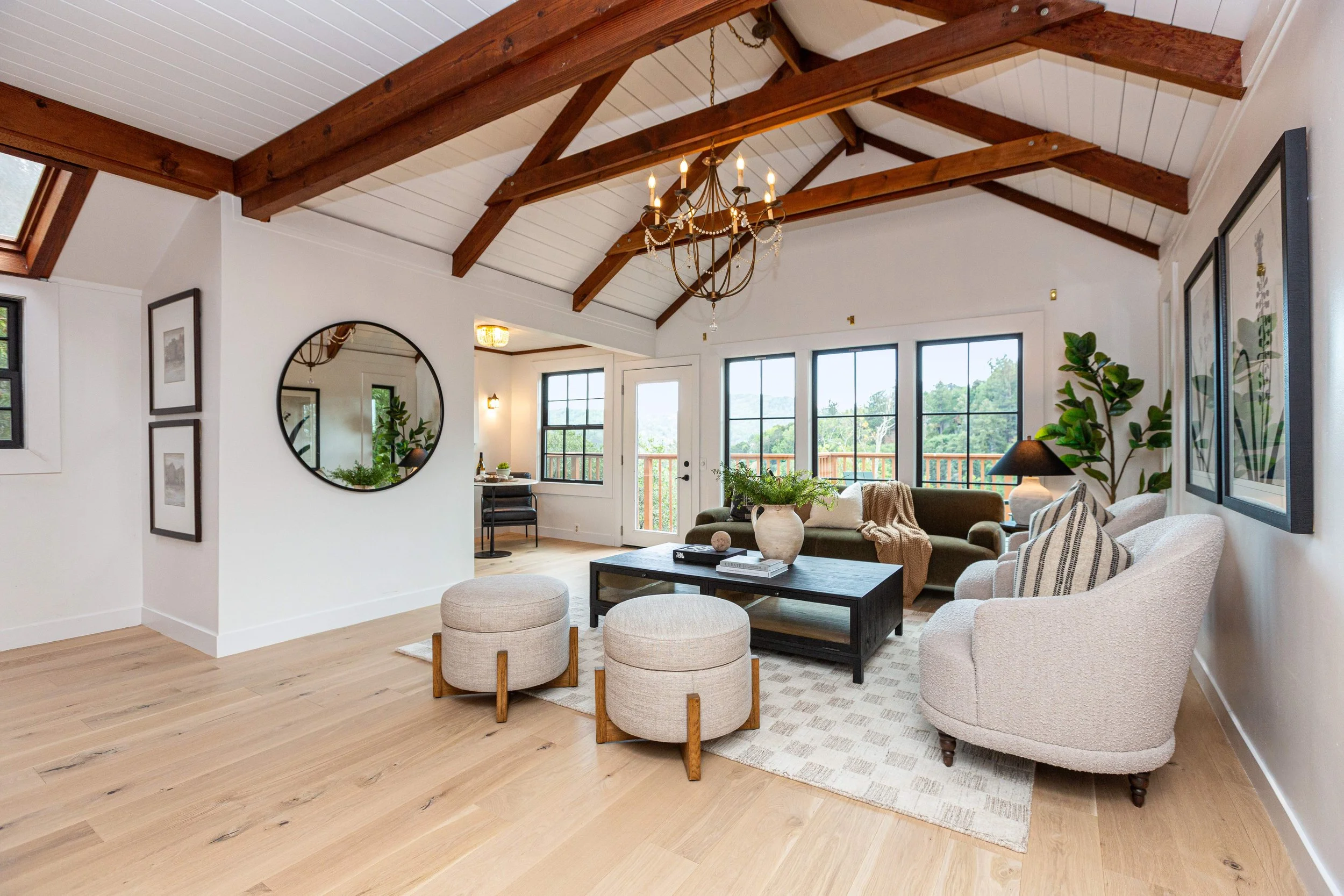 Living room with a vaulted ceiling and exposed wooden beams, large windows, a chandelier, and a mix of beige and green furniture, including two cream armchairs, a green sofa, a black coffee table, and ottomans. There are decorative plants and framed