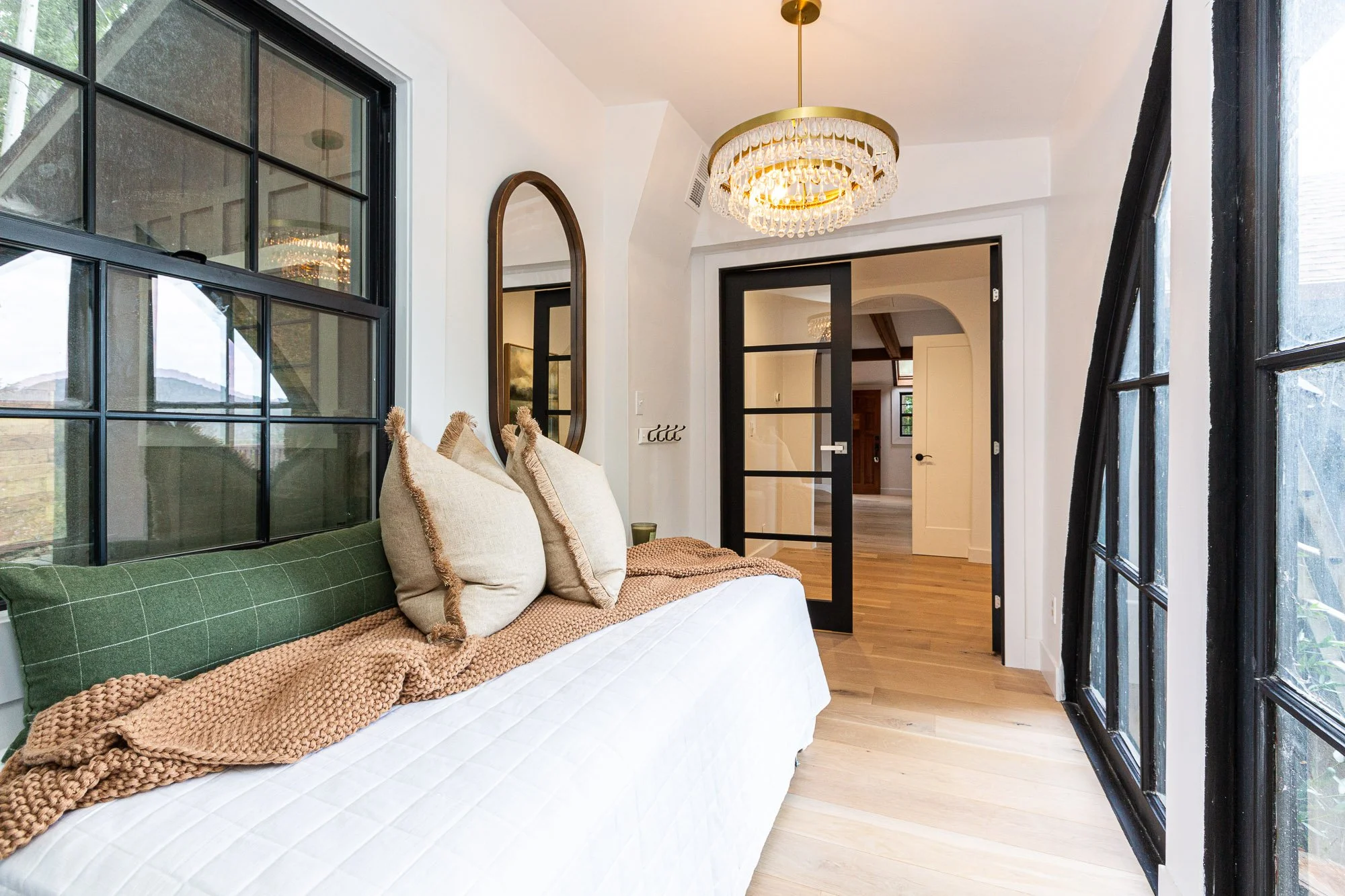 Interior of a bright room with large black-framed windows, a white bed with beige pillows and a knitted blanket, a decorative mirror, and a modern chandelier.