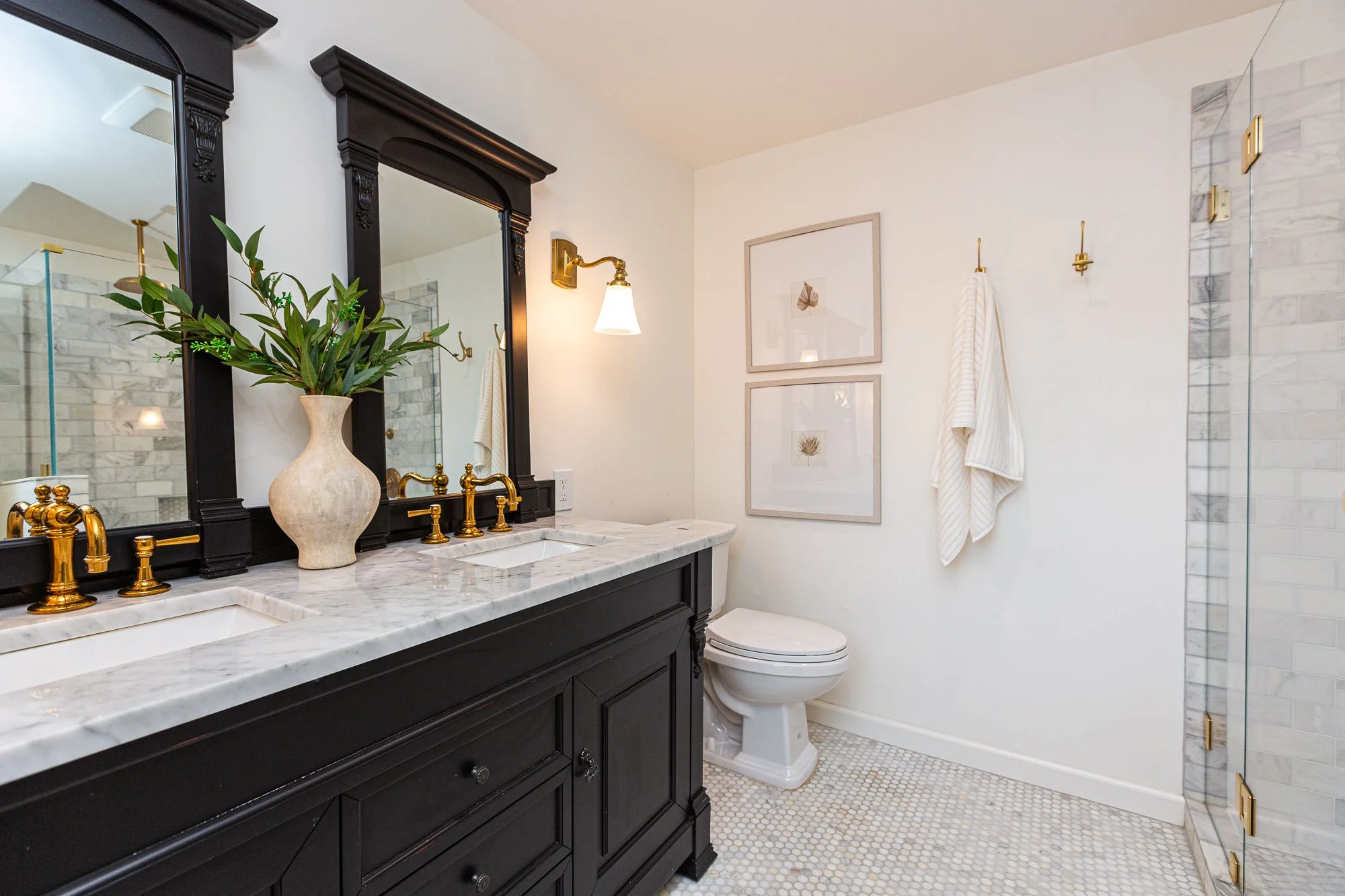 Bathroom with black vanity, marble countertop, gold fixtures, large mirror, small sink, white toilet, framed artwork, white towels, glass shower with marble tiles.