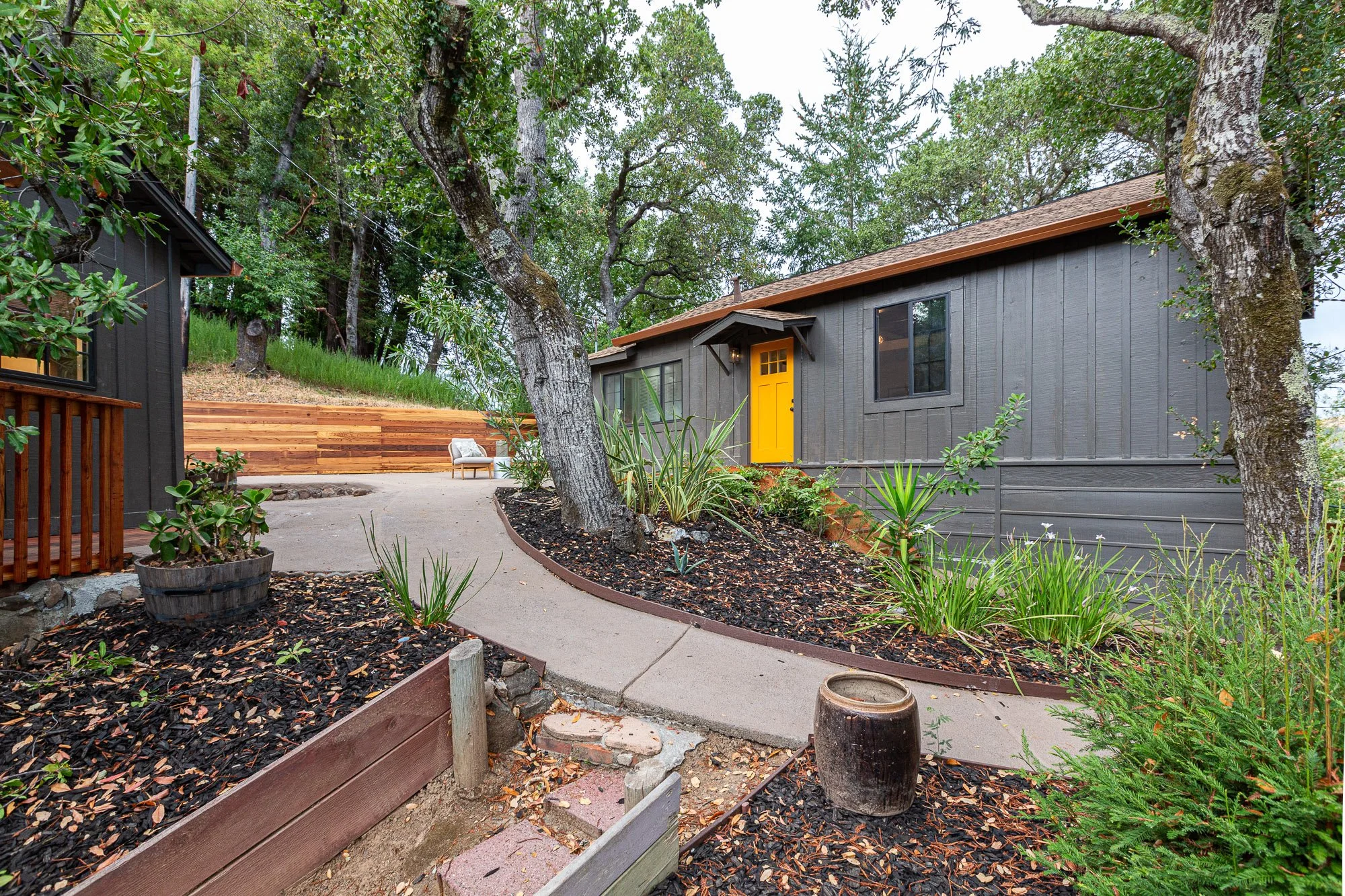 A backyard with a concrete pathway, trees, and landscaped garden beds with plants. A house with dark gray siding and a yellow front door is visible on the right. There is a wooden bench on a patio area in the background, and a wooden retaining wall o