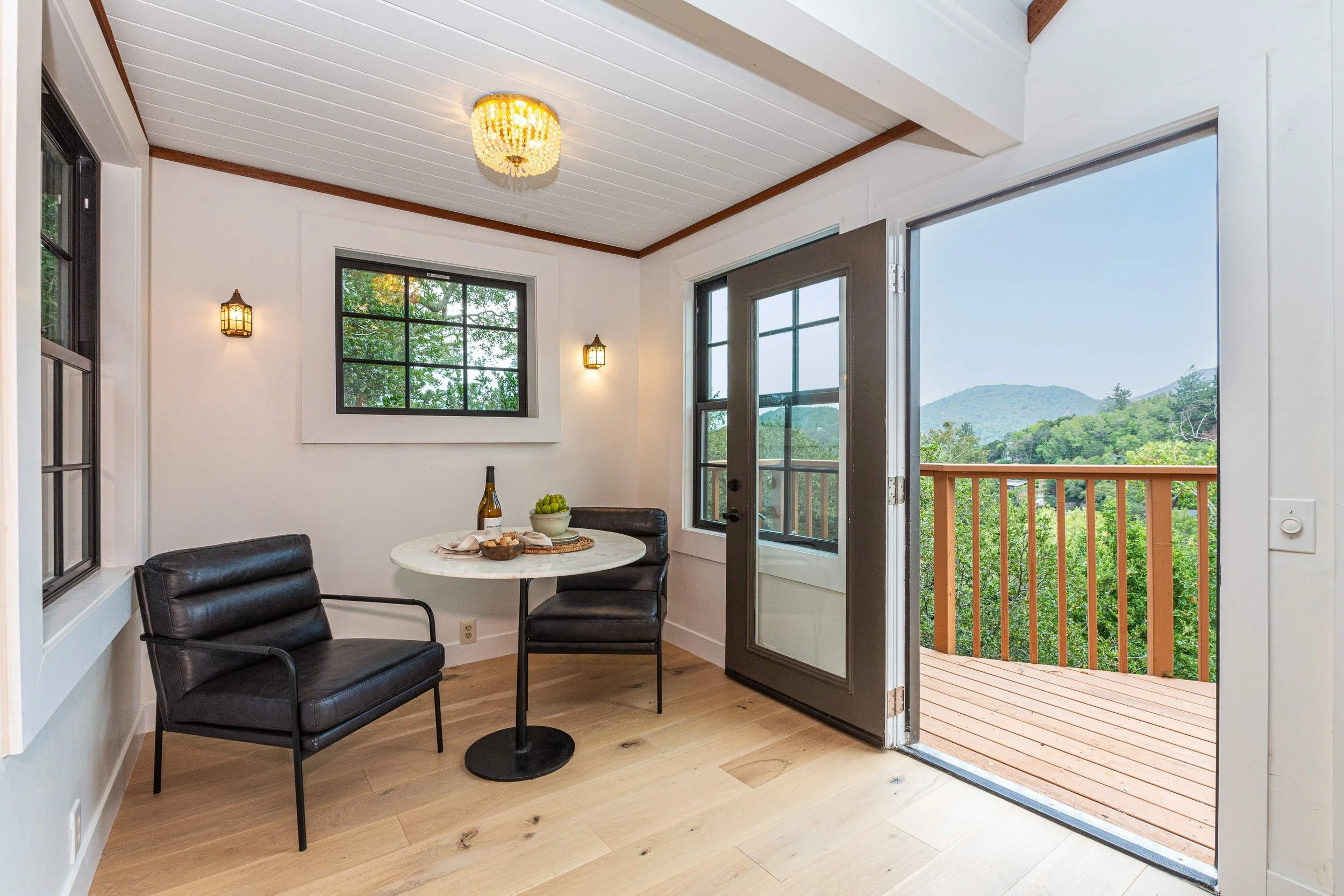 Small indoor dining area with a round white table, two black leather chairs, and a view of a wooden deck and green mountains outside through open sliding doors and windows.