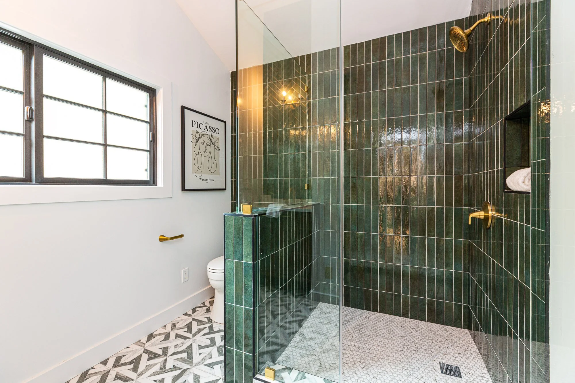 Modern bathroom with green tiled walk-in shower, black-framed window, white walls, and a framed Picasso art print. View fullsize