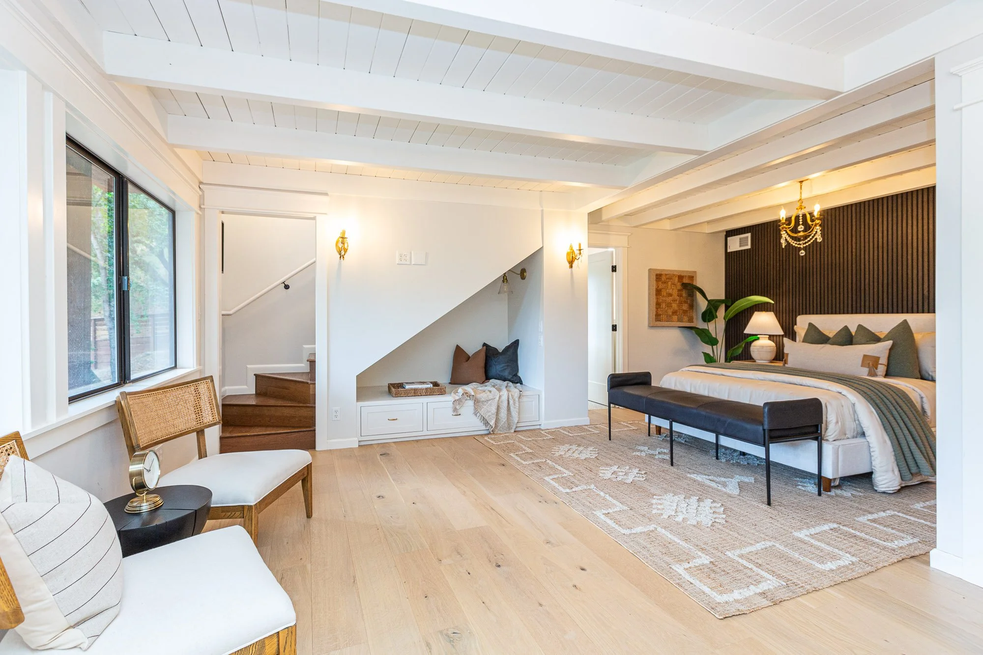 A spacious bedroom with a large bed, black bench, and a nightstand with a lamp, beside a dark accent wall and a large green plant. Light hardwood flooring and a geometric rug are visible, with a window on the left, and a small sitting area with a ben View fullsize