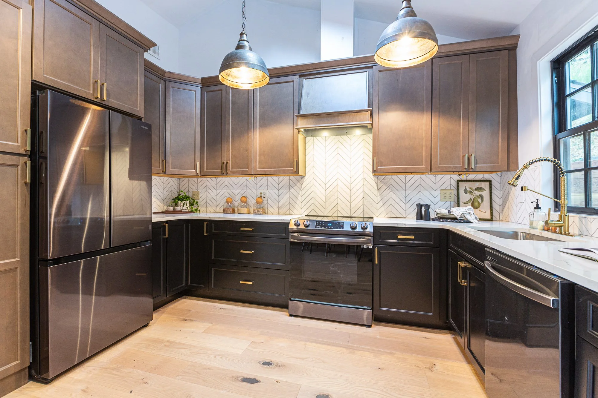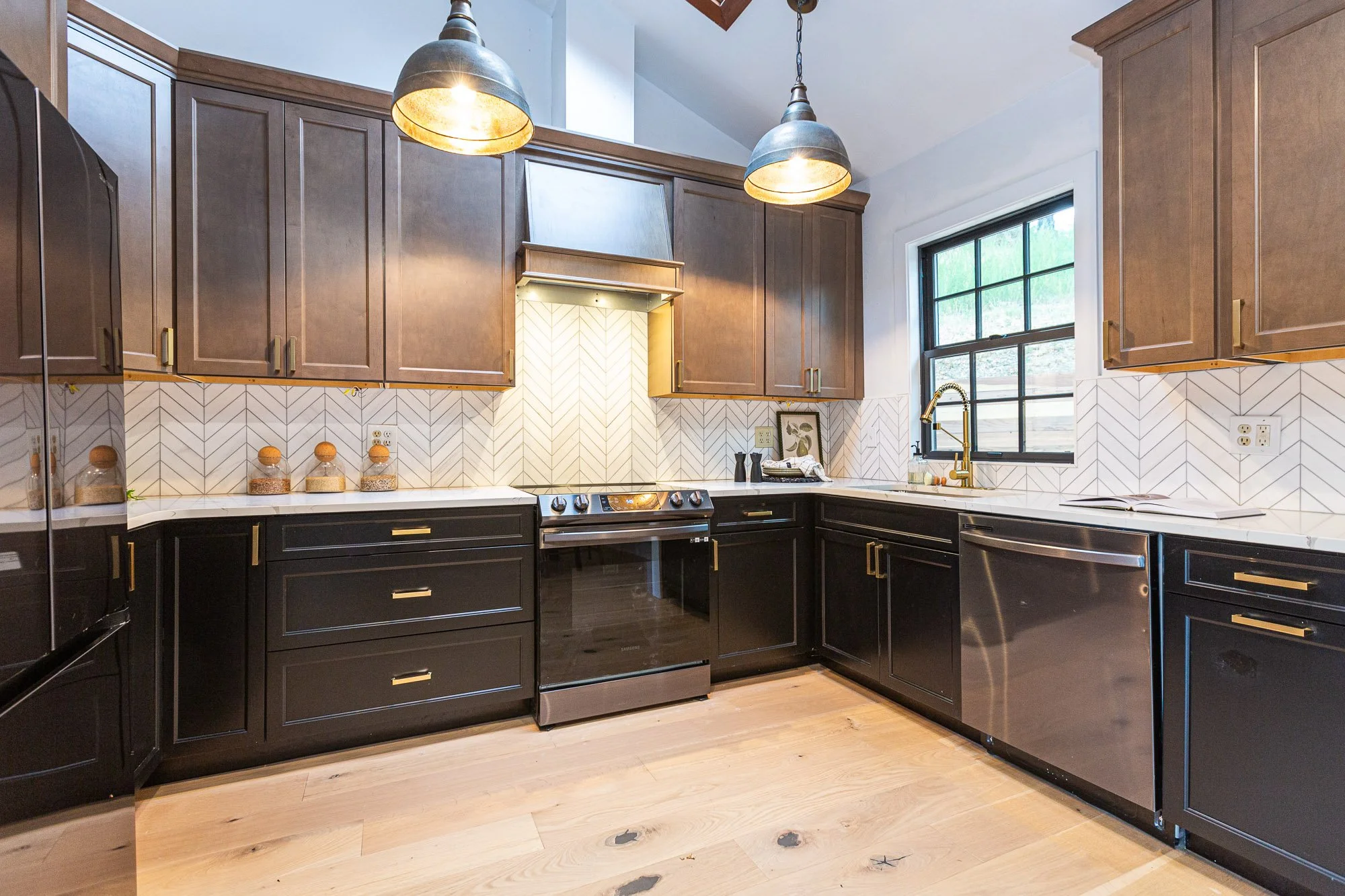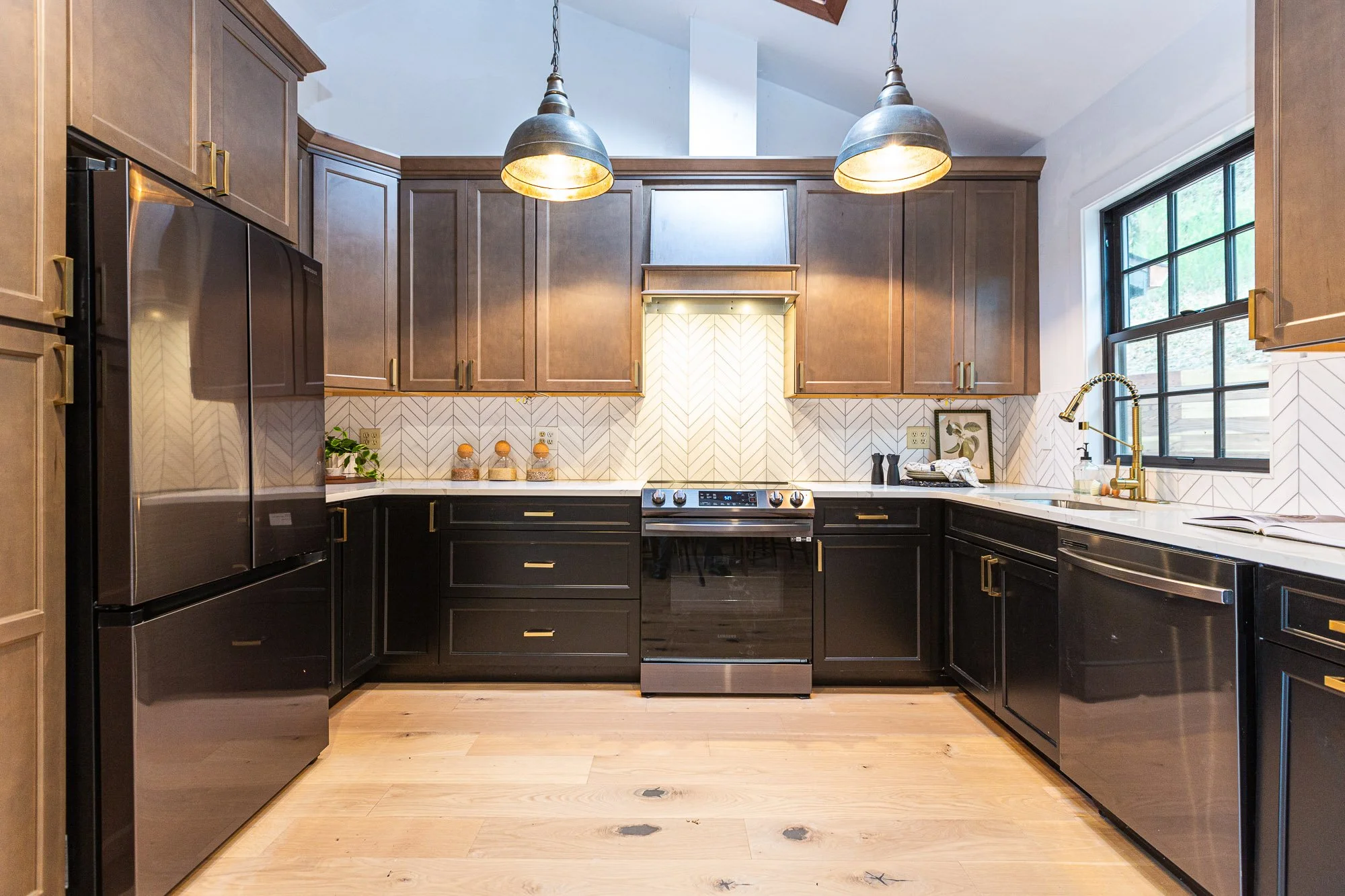 Modern kitchen with black lower cabinets, brown upper cabinets, stainless steel appliances, a gas stove, black and brass faucet, large window with black trim, and pendant lights hanging from the ceiling.