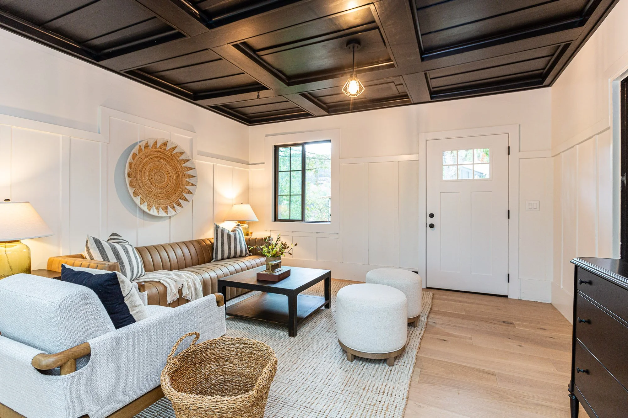 Living room with white walls, a dark ceiling, a window, two lamps, a tan leather sofa, a white armchair, two white ottomans, a black coffee table, a woven basket, and decorative wall art.