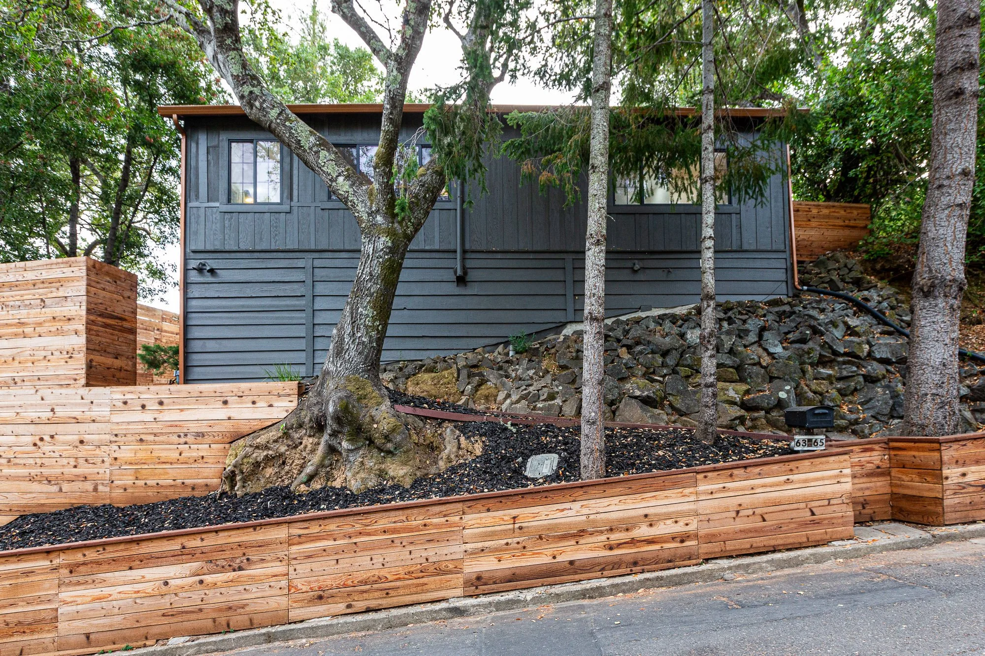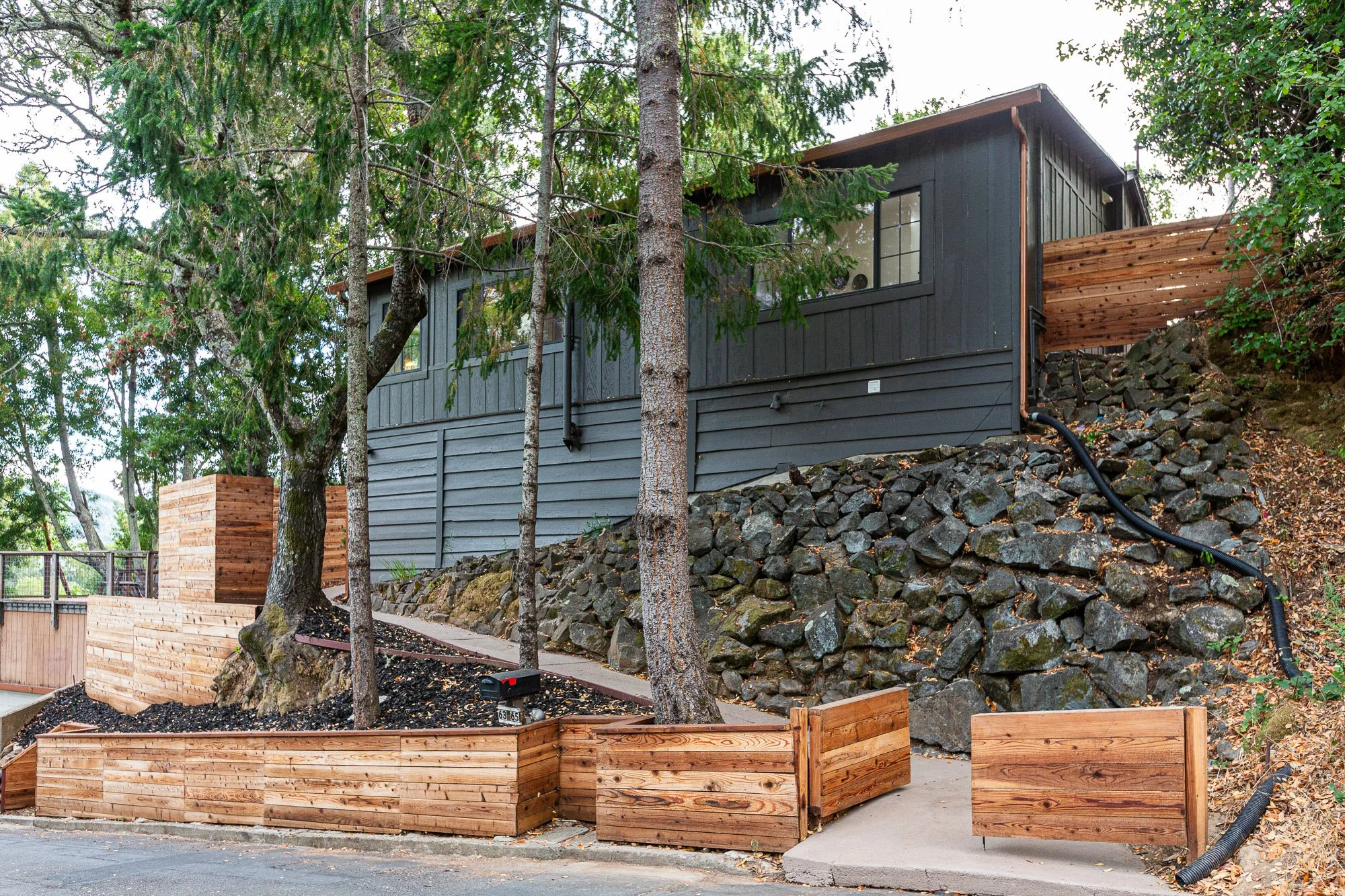 A house with dark gray siding surrounded by trees and wooden retaining walls, situated on a rocky hillside with a paved street in front.
