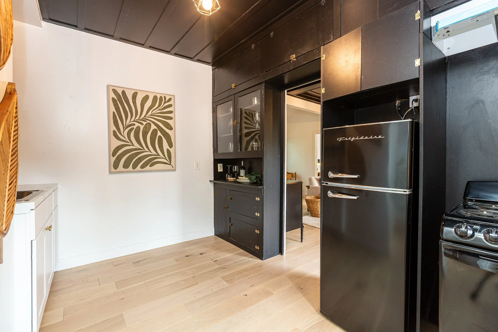 Interior view of a kitchen with black cabinets, a vintage-style black refrigerator, a black stove, a white wall with a large leafy artwork, and light wood flooring. View fullsize