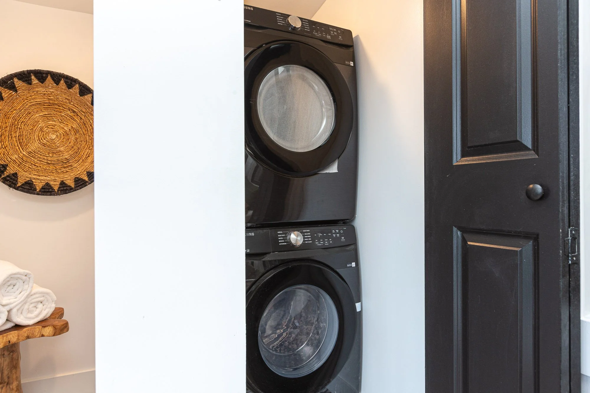 Stacked black washing machine and dryer inside a laundry closet with a black door.