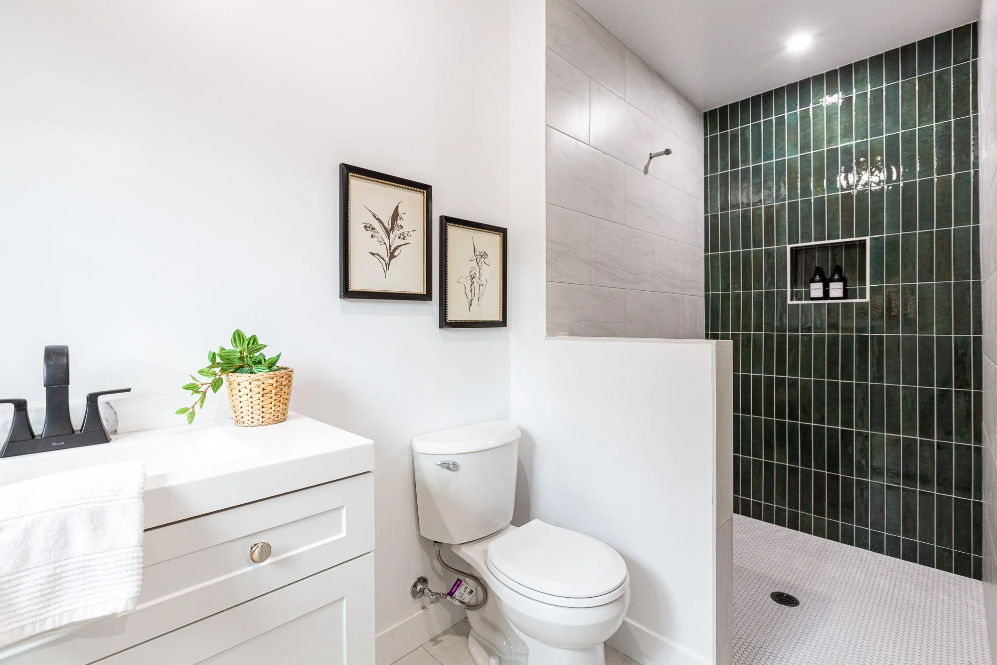 Bathroom with white vanity, small potted plant, framed artwork, white toilet, partial shower with dark green tile walls and built-in shelf