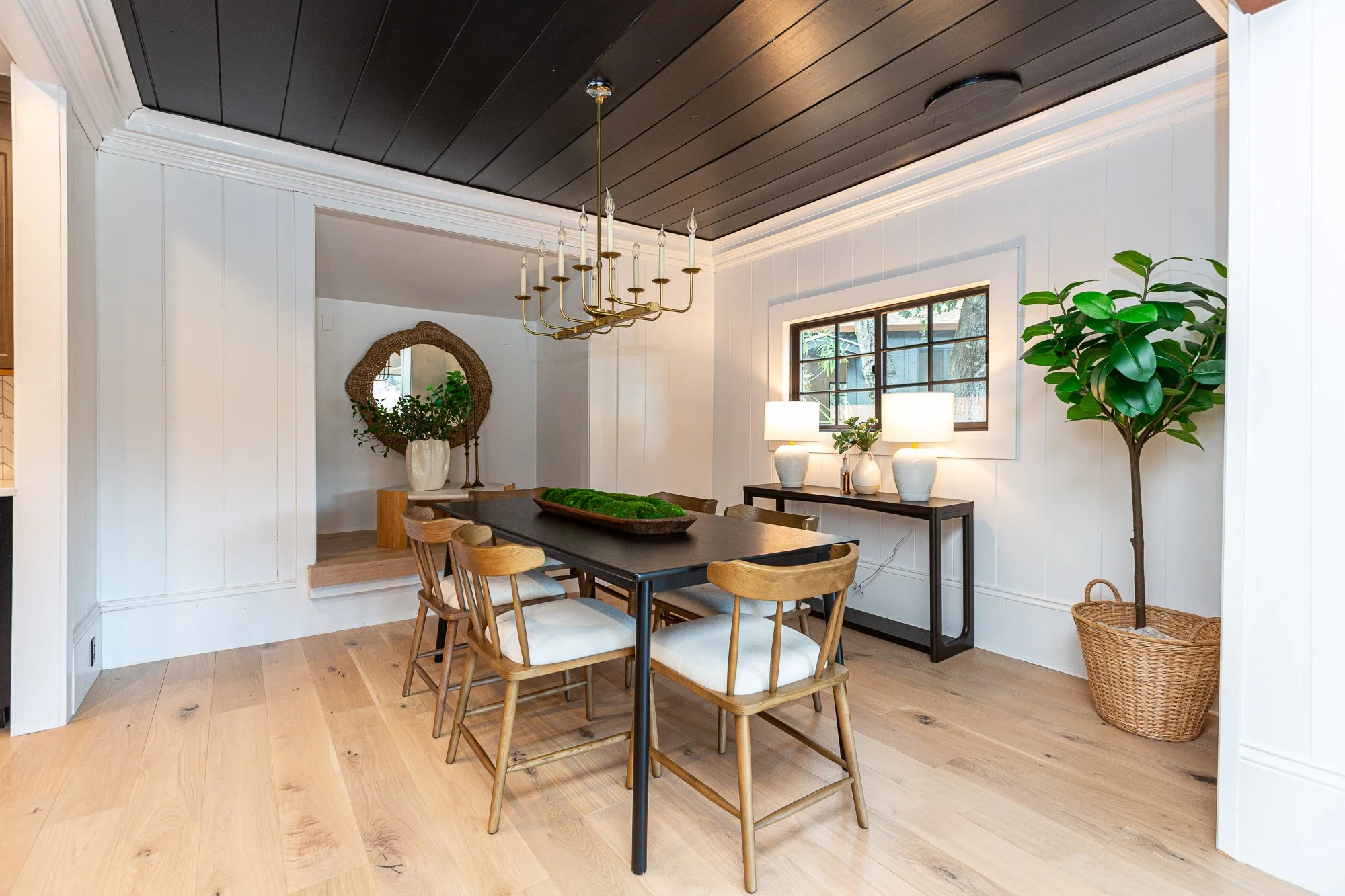 A modern dining room with a black table, six wooden chairs with white cushions, a black sideboard with three white lamps, a window, an indoor plant in a wicker basket, and decor accents.