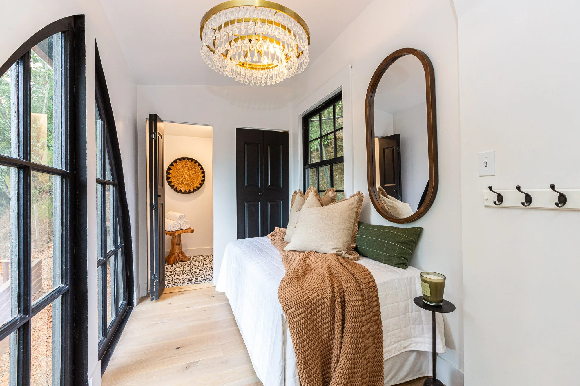 A cozy bedroom with a bed topped with beige pillows and a brown throw blanket, a side table with a candle, a large oval mirror on the wall, and a chandelier hanging from the ceiling; adjacent doorway reveals a bathroom with rolled towels and decorati