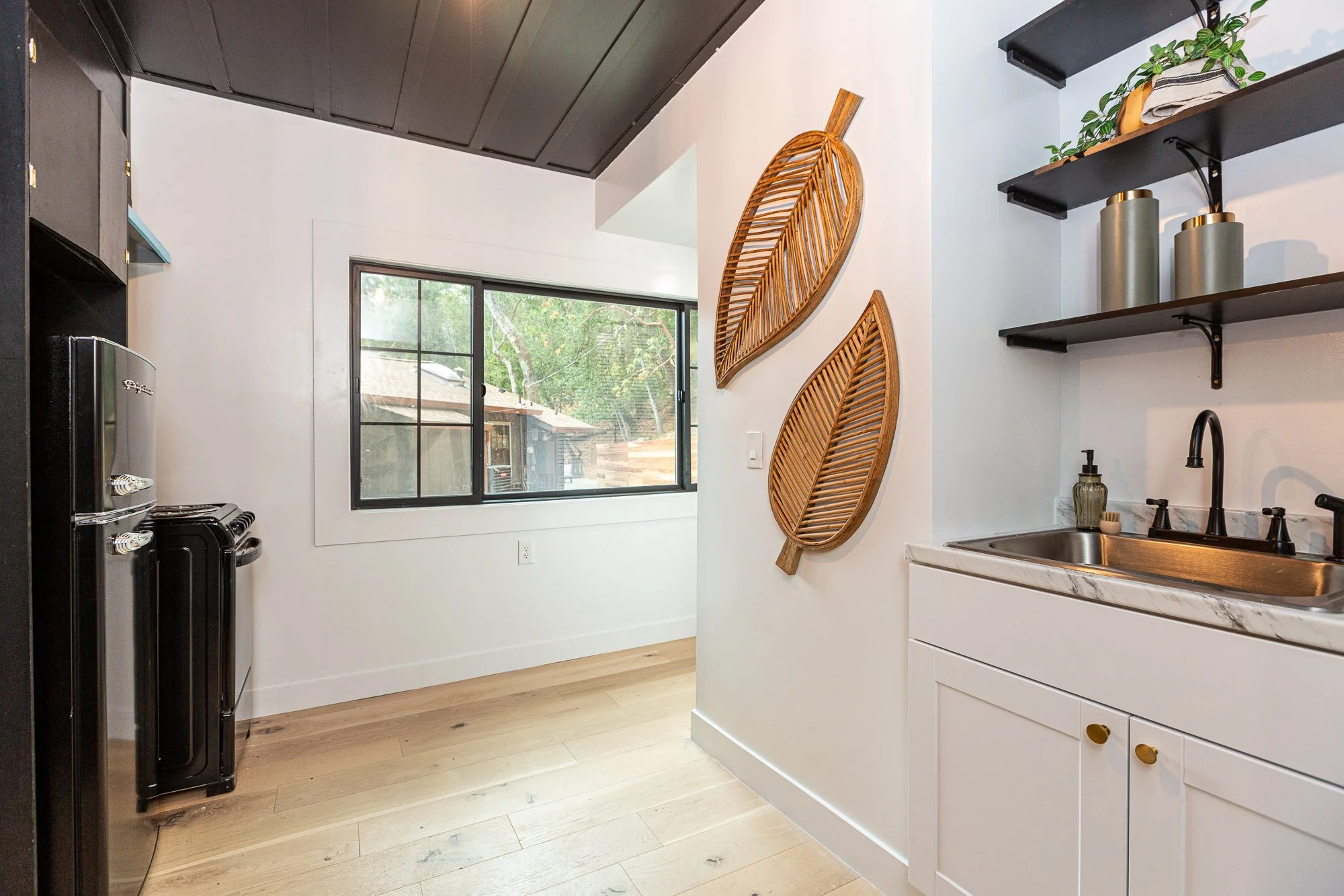 Interior of a modern kitchen with a black ceiling, white walls, and a wooden floor. There's a large window showing trees outside. On the wall, there are two wooden leaf-shaped decorations. The right side has a small sink with black fixtures, open bla