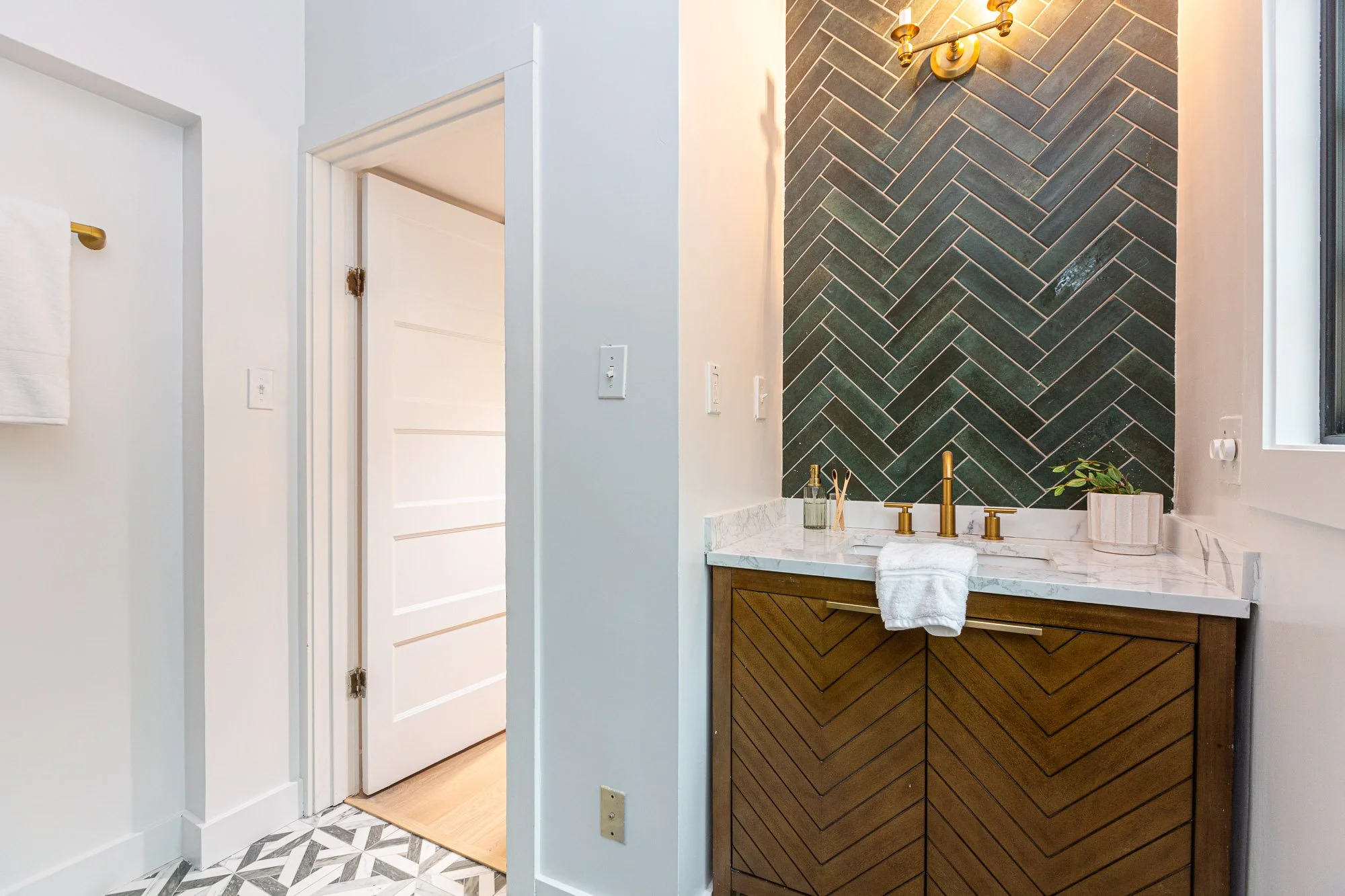 Modern bathroom with a dark chevron-patterned tile wall and a wooden vanity with a white marble countertop, gold fixtures, a towel, and a potted plant, next to a window and white walls. View fullsize